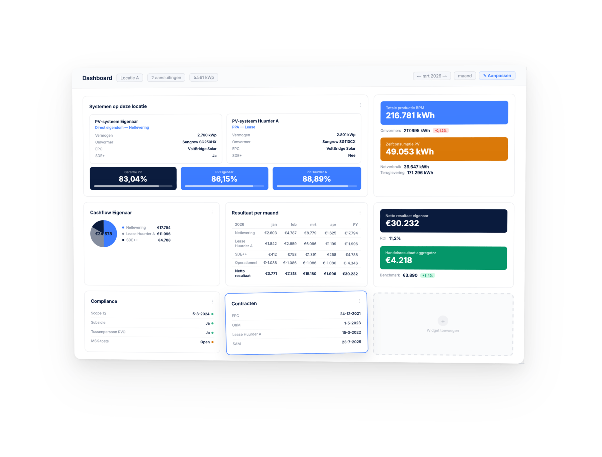 Alles uit Essentials, plus financiële dashboards, aggregator-controle, O&M-oversight, compliance-bewaking, huurderverrekening en proactieve optimalisatie. Voor eigenaren die het energievraagstuk volledig willen loskoppelen.